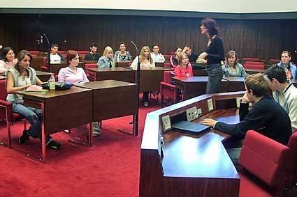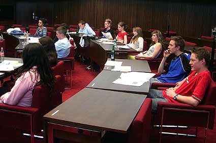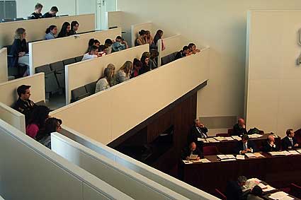 Am 5. Mai ging es dann zu einem Erkundungsbesuch ins Parlament. Wir durften im Plenarsaal (Sitzungssaal des Parlaments) Platz nehmen und Frau Weber vom Besucherdienst erläuterte uns die Vorgänge im Parlament und versorgte uns mit der Tagesordnung für den folgenden Mittwoch, an dem wir eine Sitzung besuchen wollten.
