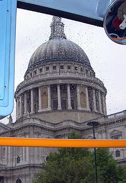 On a double-decker bus we passed St. Paul's Cathedral in the rain.