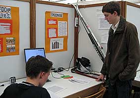 Jared Carsten-Frerichs (10R) und Moritz Berger (10R) gewannen einen Sonderpreis Mobilfunk mit ihrer Arbeit "Mit (RFID-) Chip schneller ins Ziel?" Sie untersuchten mit der RFID Technik das Zeit-und Geschwindigkeitsgefühl von Ski-Lang-läufern und planen, eine Indoor-Anlage selbst zu bauen. |