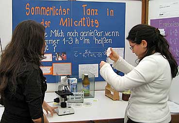 Sümeyye Erbas (10I) und Secil Dinc (10I) haben mit ihrer Arbeit : "Der sommerliche Tanz in der Milchtüte" sehr fleißig die Keime gezählt und eine mathematische Formel entwickelt, um die Keimzahl rechnerisch zu bestimmen. Sie waren verständlicherweise enttäuscht, nicht platziert worden zu sein. |