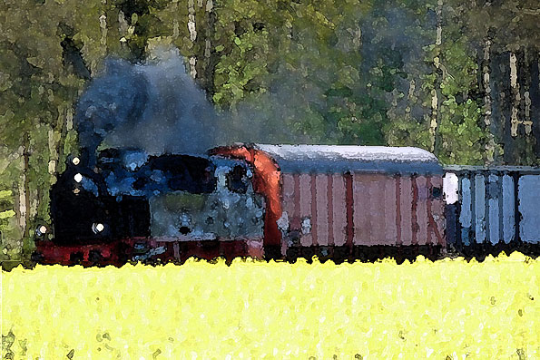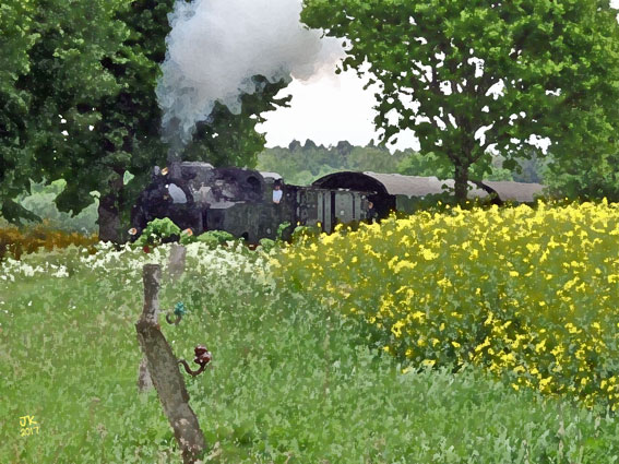 Museums-Dampfzug „Jan Harpstedt“ hinter Rapsfeld bei Dünsen (2016) |