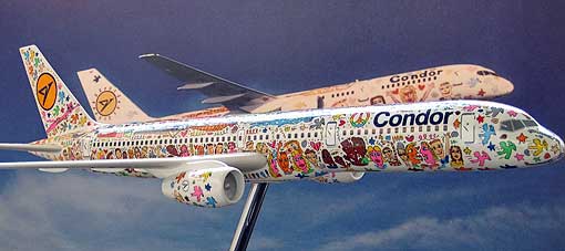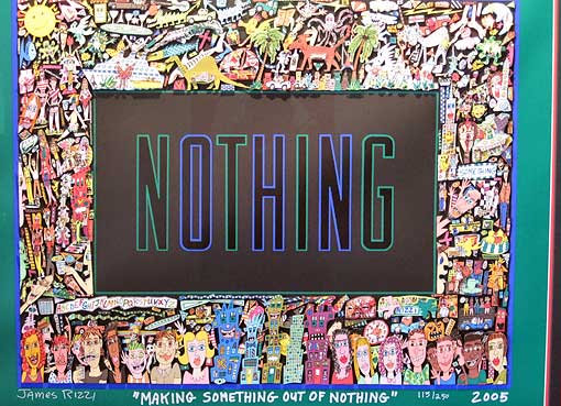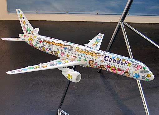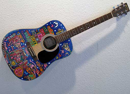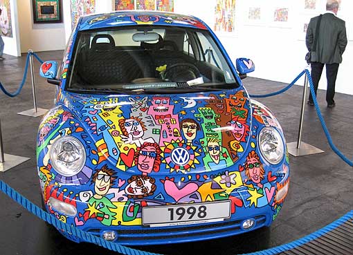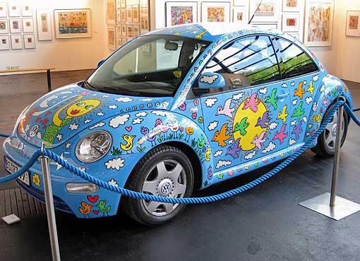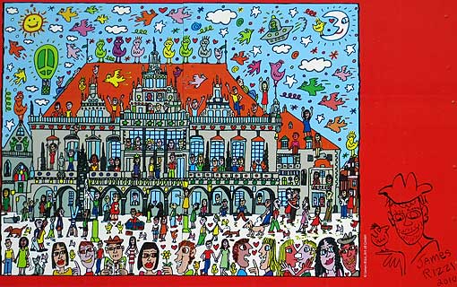 Links: von James Rizzi bemaltes Originalstück der Berliner Mauer |